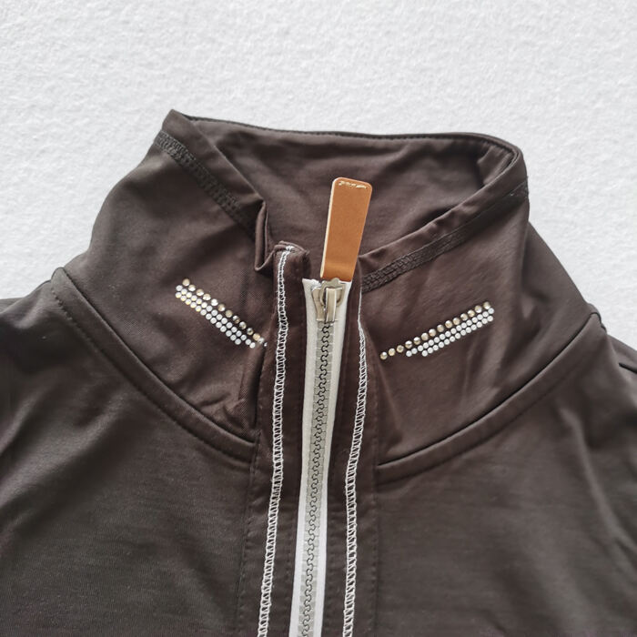 Echipament equestrian francez cu glugă, confecționat dintr-un amestec de bumbac și elastan sau din materiale furnizate de client. Prezintă opțiuni personalizate de logo, inclusiv tehnici premium de aplicare cu folie (aurie/argintie). Ideal pentru antrenament și îmbrăcăminte equestrian casual.